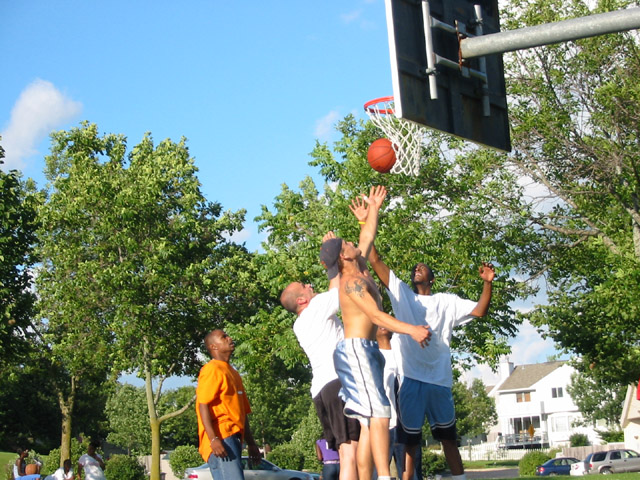 As I was saying before, One of the things that Casey and I would do together is play basketball. I don't have many photos of this, but Taylor came along one time and snapped a few. Here's Casey and I going for a rebound in a game at a west side park: