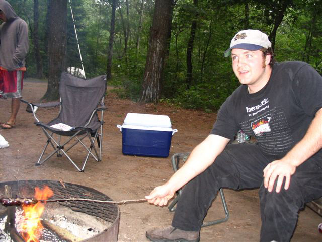 We thought the photo would look really old if it was in black and white. Nevermind the powerboat in the top right hand corner. A third term that was invented was 'Jiz Nasties' which is basically used to describe Rapids. At one point in our camping trip, we decided to rent a couple of metal canoes and race them up a river. In one canoe was me and Brent, and the other had Jared and Aaron. It was one of the most hilarious experiences of my life. There were several places where we needed to carefully navigate rapids and rocks, and other times we simply had to scrape our boat along a shallow spot before continuing on. We went for about two or three hours before stopping and returning. It was pitch black by the time we got back. Sadly, we didn't get any pictures of this hilarious endeavor, but here's a picture of Doug Diamond grilling brats: