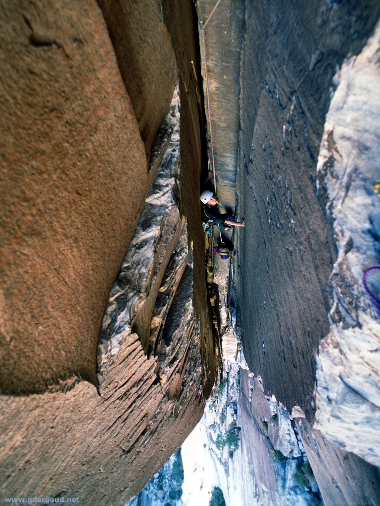 As you can see, the wall is very intimidating and yet majestic. I was awestruck that we were going to climb directly up the middle of it. After we got our rack ready, Ivan led the first short pitch to the ledge before the right-angling crack. I'd read that this crack was one of the classic pitches so I was excited to lead it. At first I definitely had a few butterflies in my stomach about being on trad lead, but after making a few moves I settled in and really started enjoying myself. The pitch was challenging but not too bad, and the gear was great. There were even a few unnecessary bolts next to the crack in spots, not sure why. Here's a really nice picture of this pitch taken by a famous climbing photographer named Blitzo: