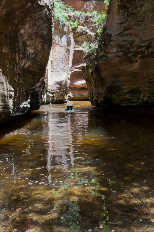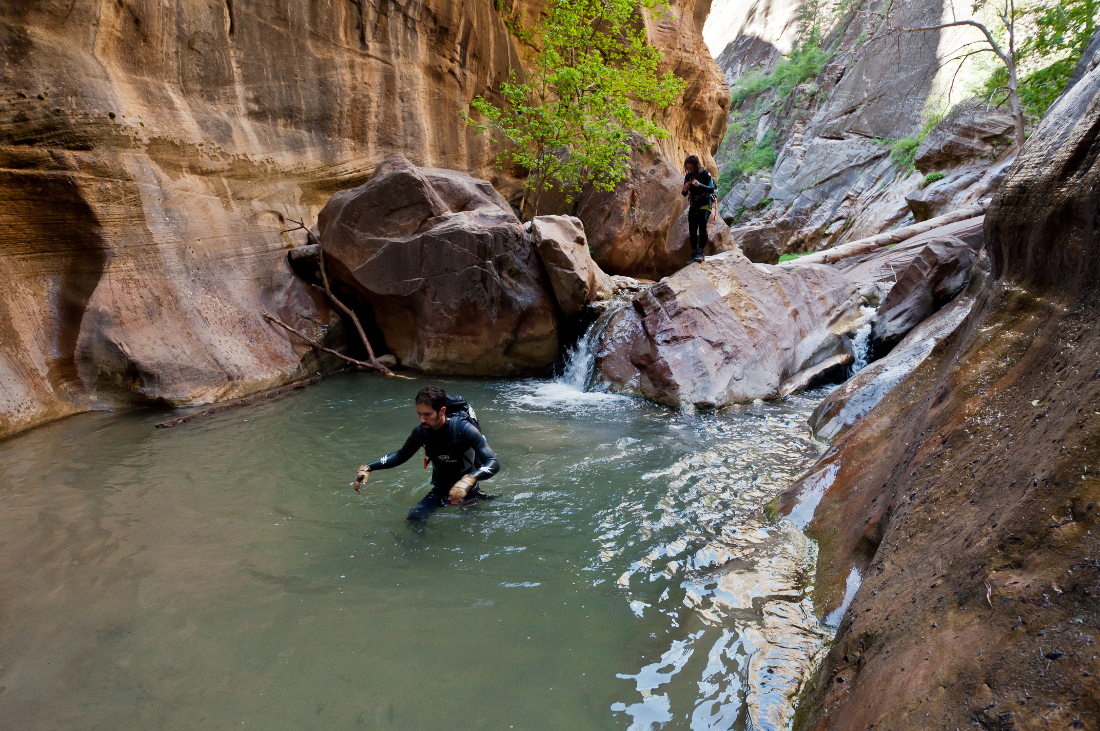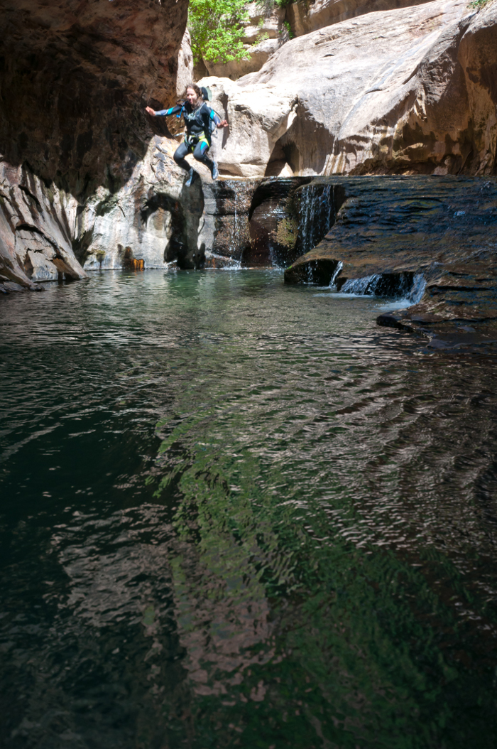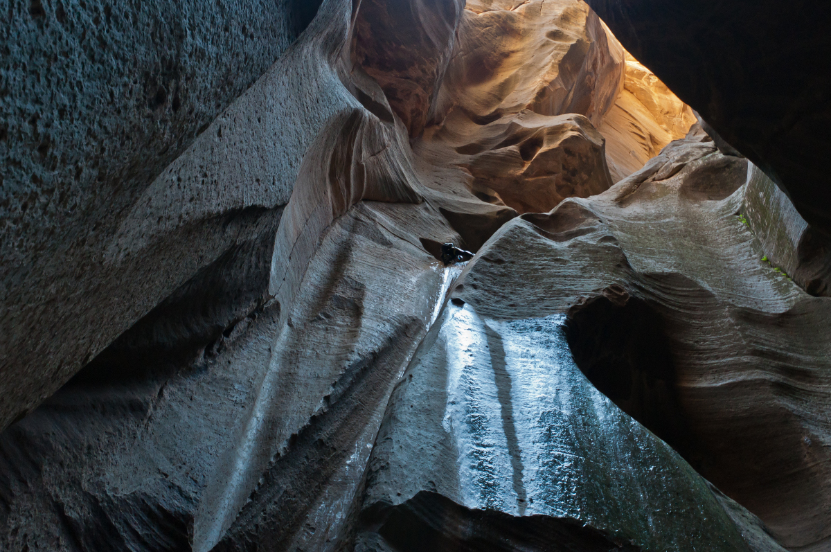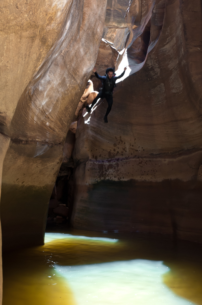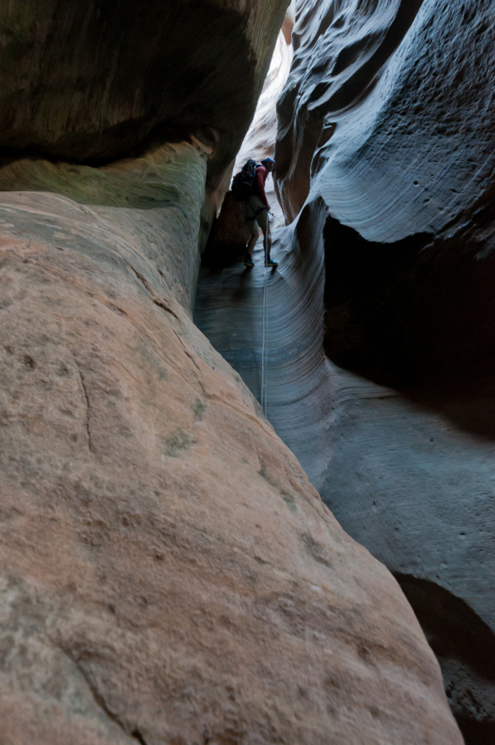 Shortly thereafter we came to the first rappel in Big Canyon, and it was much more exciting than we expected. Since the canyon had been so dry up to this point, we never expected that we might be rappelling into a deep pool, but at the bottom there was a spring coming up from underground and this is what we were presented with: