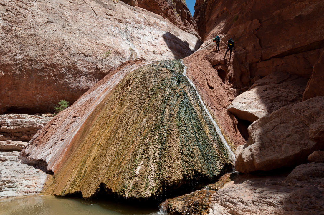 The rappel that we skipped came down a strange looking waterfall. It appears that the spring water was heavily mineralized, and the minerals were deposited at this waterfall for thousands of years, creating a massive fan shape: