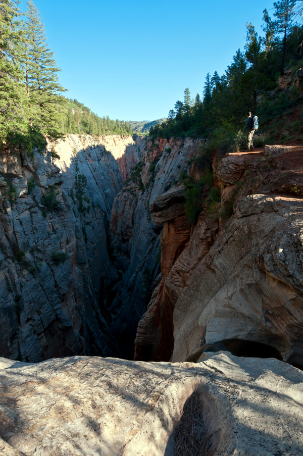The quality of the canyons that we had done thus far was so impressive that we couldn't imagine anything better. Nonetheless, we had been told that Mystery Canyon was the guidebook author's favorite in Zion, and we had no idea what was in store for us. Like Engelstead, Mystery started on the East Mesa and we chartered another shuttle to be dropped off up there. Finding the entrance to Mystery canyon proved somewhat difficult and we actually got turned around and walked almost all the way to Observation Point by accident. Eventually we found the narrow trail down into the cleft that we hoped was Mystery. Here's the view prior to the descent: