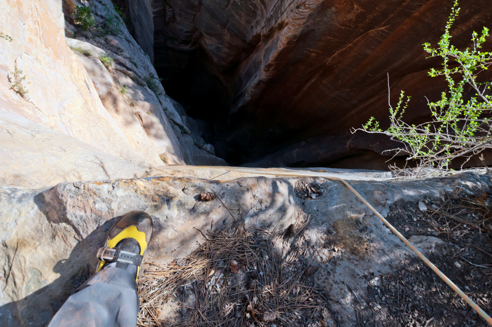 Looking to the left and right of me, I couldn't see anywhere that a rappel could be setup or that we could hike to continue. It appeared that we had entered the wrong sub-canyon and now we'd have to hike four hours back to the car to start again! We were all really bummed, but we didn't see any other options. Undeterred, Ivan decided to climb over the buttress to the right to see if there was anything that could be done. He reported that he believed a rappel might be possible down a chimney he had found. I was skeptical but I followed him and took a look. I was surprised to find that the chimney looked completely possible to rappel, and not only this but at the bottom of the chimney there was a scree slope that should take us conveniently down to the stream-bed at the very bottom of Big Canyon! I had Ryan come over to confirm, and he agreed that it was worth a shot. Here's Ivan setting up the rappel anchor: