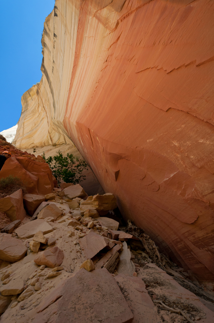 After about four rappels we exited this slot and found ourselves in an area of many shades of sandstone. Ivan and I scrambled up to a ledge for a good photo op: