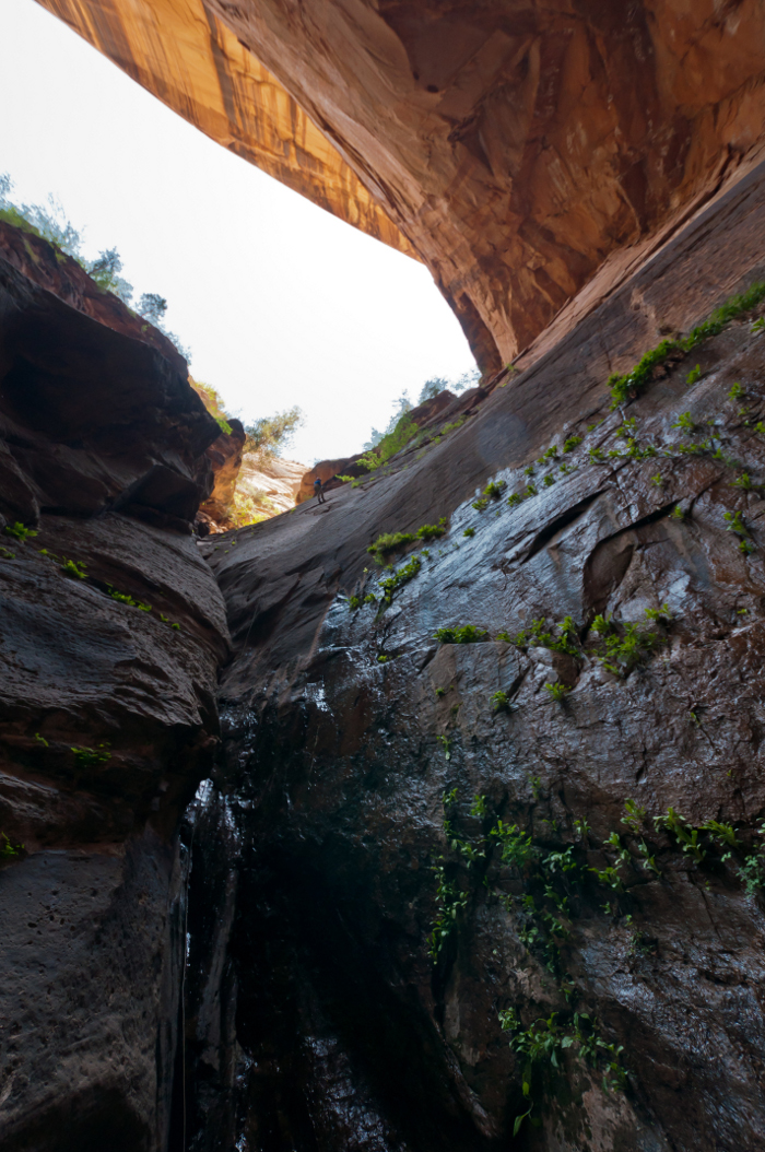 The pool of water at the bottom of the rappel was sheltered by an overhanging roof of red sandstone. Below the roof there was water seeping out of the rock and many plants were growing in this sort-of hanging garden: