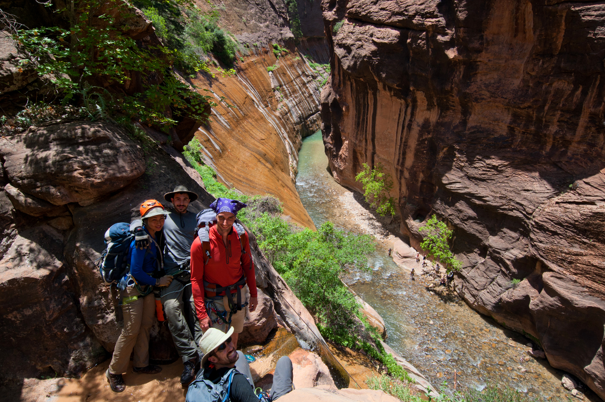 A little further down the canyon we reached the place where Mystery intersects the Narrows. We had passed this place on Day 1 and were curious if it was in fact the exit of Mystery.The rappel into the narrows was about 130 feet long and included a dozen or more spectators. At one point we were called the badasses of Zion :-) Here's a picture of most of the group at the top of the final rappel: