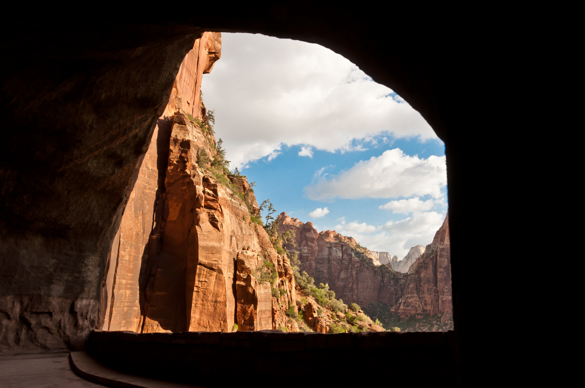 The following day we drove from Zion to the South Rim of the Grand Canyon. Once again it was Ivan and I in one car and the rest of the crew in the other car. Here's our last view of Zion canyon from one of the windows in the Mt. Carmel tunnel: