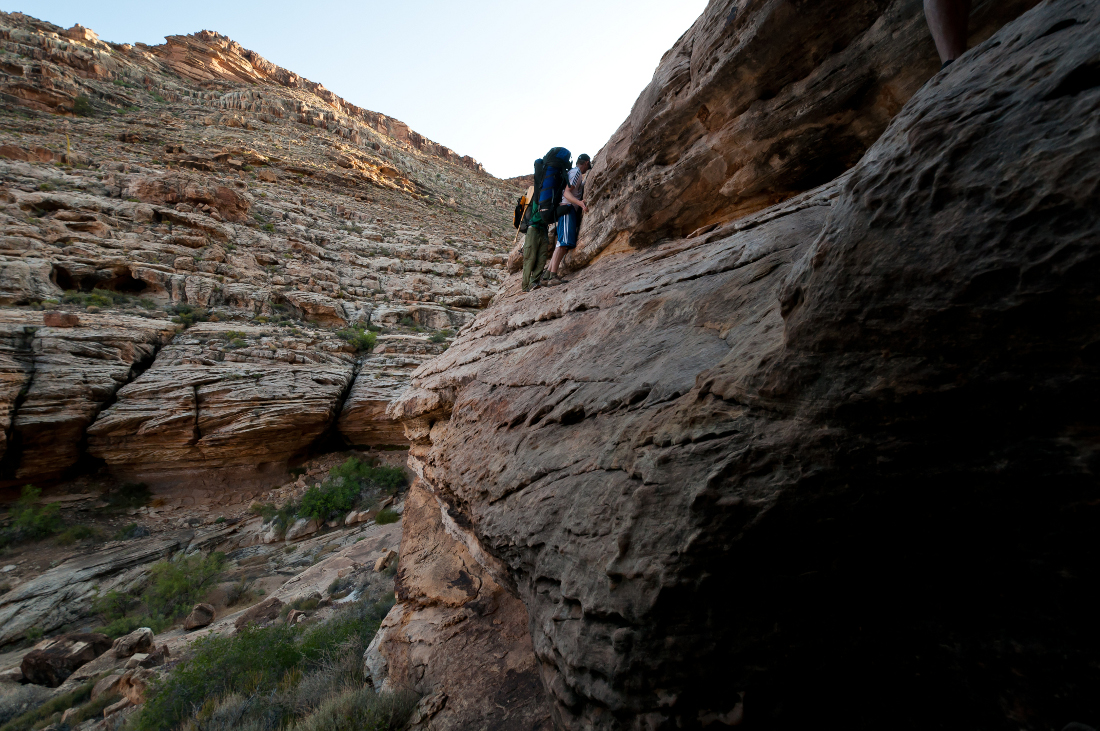 The hiking was completely off-trail and required lots of exploration to find our way around obstacles. Although we always had the ability to rappel if absolutely necessary, we usually found ways that didn't require it. Here's a spot where we had to do a friction traverse: