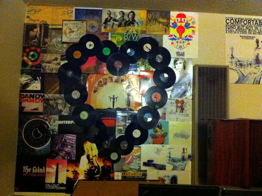 I spent the following day at Ivan's new apartment in Pasadena. He had recently moved from Pasadena Gateway Villas into a place on Mar Vista just North of the freeway. One very important item that remained unfinished was the transfer of my wall of albums and music posters. Setting it up is always a time-intensive endeavor, and this time we didn't have a good theme to work with. Shortly after we started on it, though, someone came up with the idea of creating a heart out of the vinyl and having the album covers and posters form the backdrop. Once we had the idea it took about three hours to finish. Here's a look at the new incarnation: